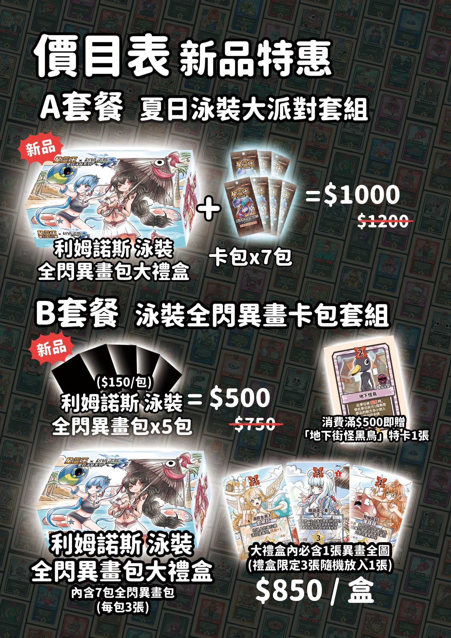 隆重推出與人氣利姆諾斯合作的「泳裝大禮盒」,裡面充滿了許多火辣辣的異畫閃卡,還能抽到美美的大獎泳裝全圖 !